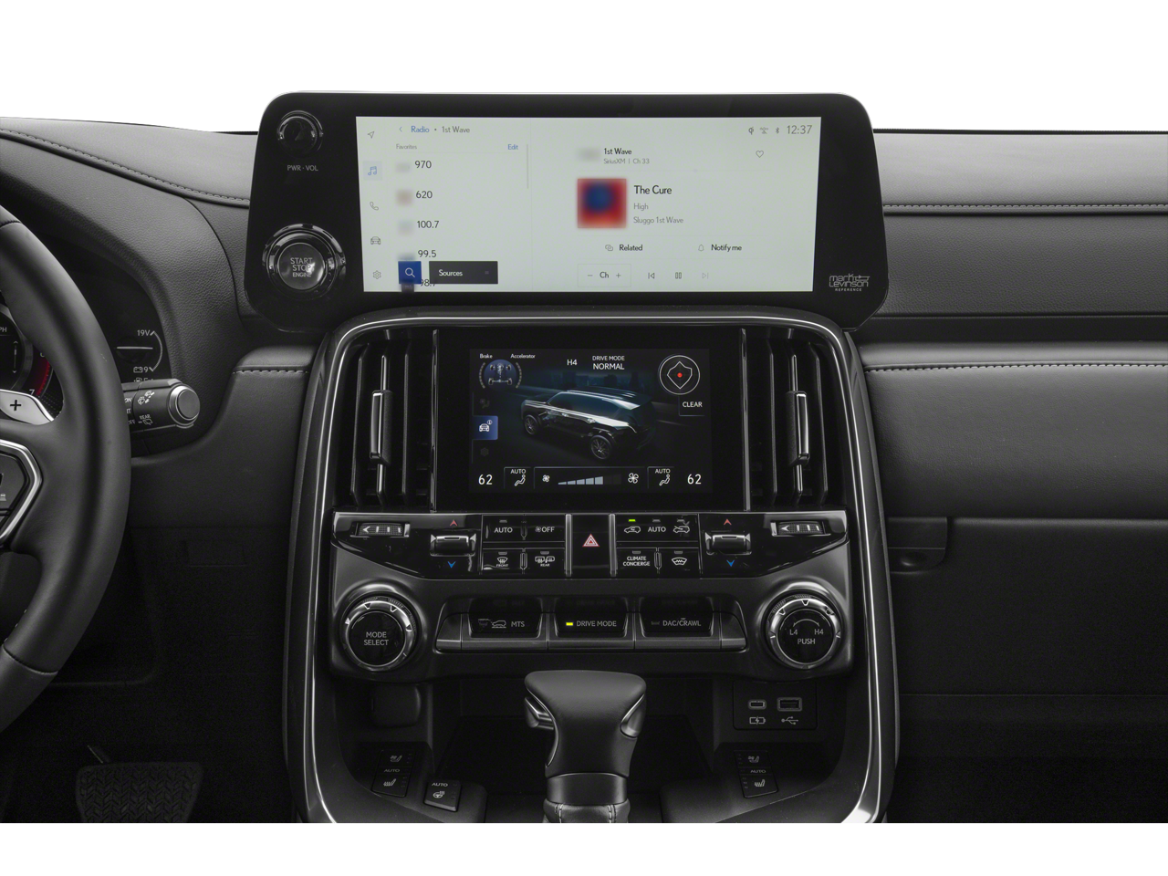 - Radio: Lexus Interface -inc: 12.3" touchscreen display, Bluetooth® and USB smartphone connectivity, wireless Apple CarPlay integration, wireless Android Auto compatibility, SiriusXM (3-month Platinum Plan trial subscription is included) and Mark Levinson 25-speaker 2,400-watt reference surround sound